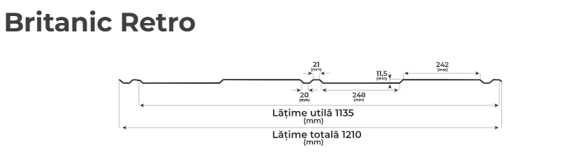 Britanic Retro este profilata din oțel de grosime între 0,45 și 0,60 mm, zincat (Z225-Z275)